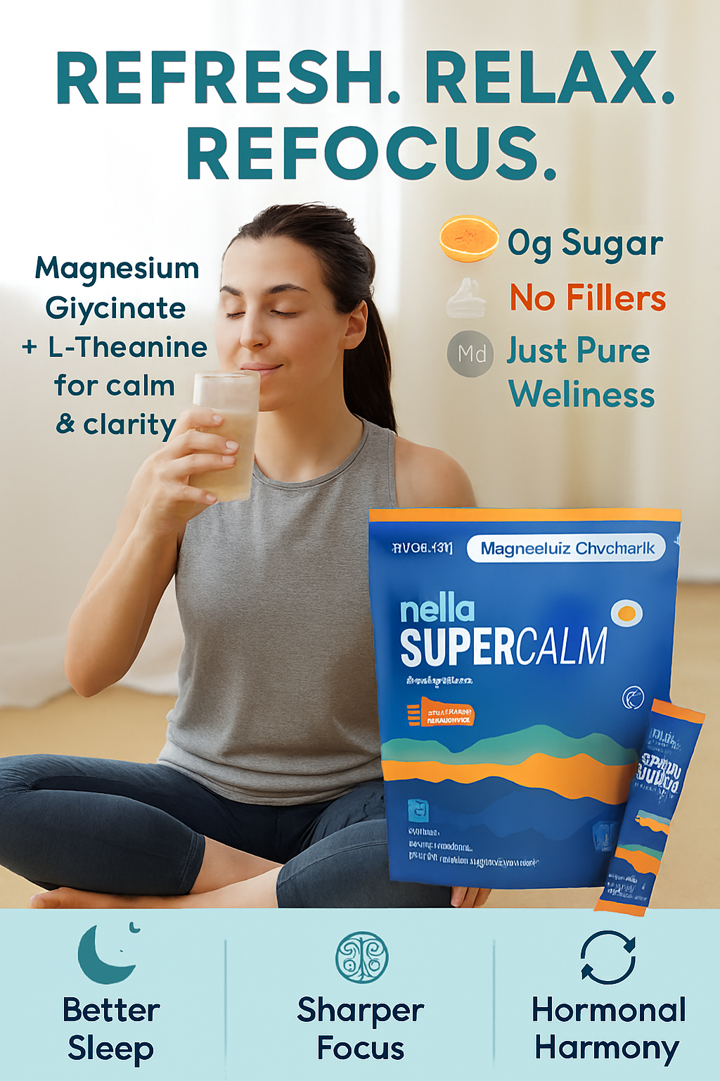 Nello Supercalm Drink mix is a natural calming formula made with ashwagandha, magnesium and plant based adaptogens. It helps you manage stress, improve sleep quality and balance your mood- all in a refreshing drink. Perfect for busy people who want to unwind, feel centred and wake up restored.